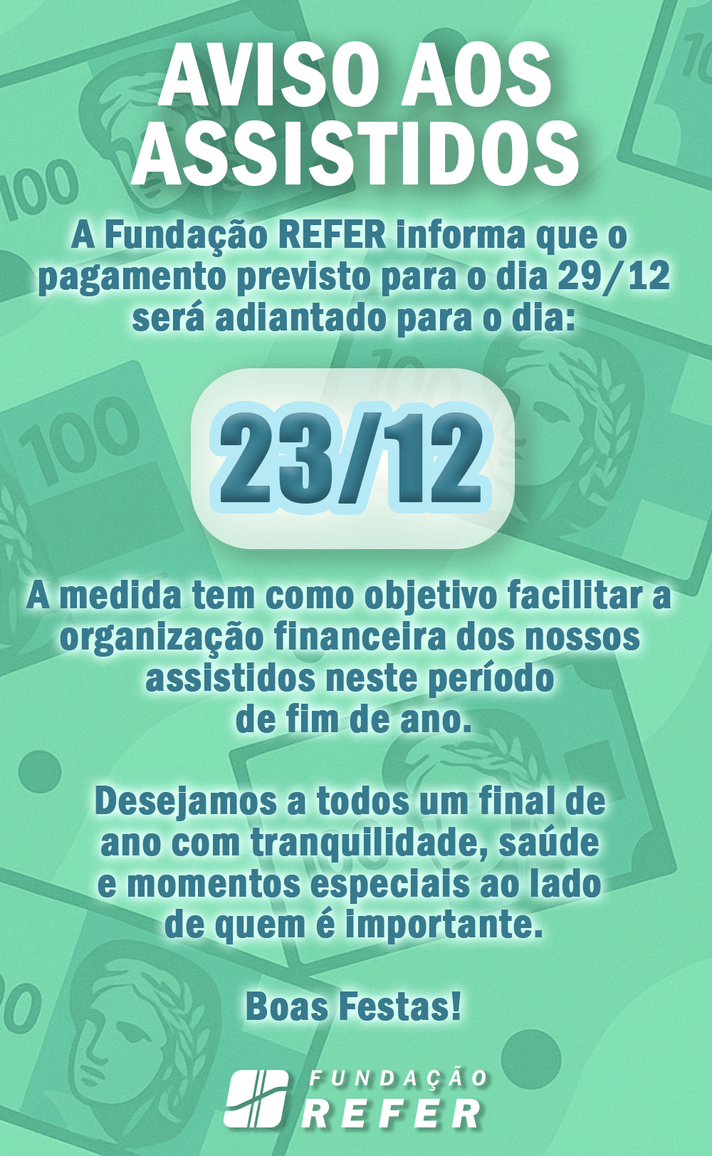 A Fundação REFER informa que o pagamento previsto para o dia 29/12 será adiantado para o dia 23/12. A medida tem como objetivo facilitar a organização financeira dos nossos assistidos neste período de fim de ano.
