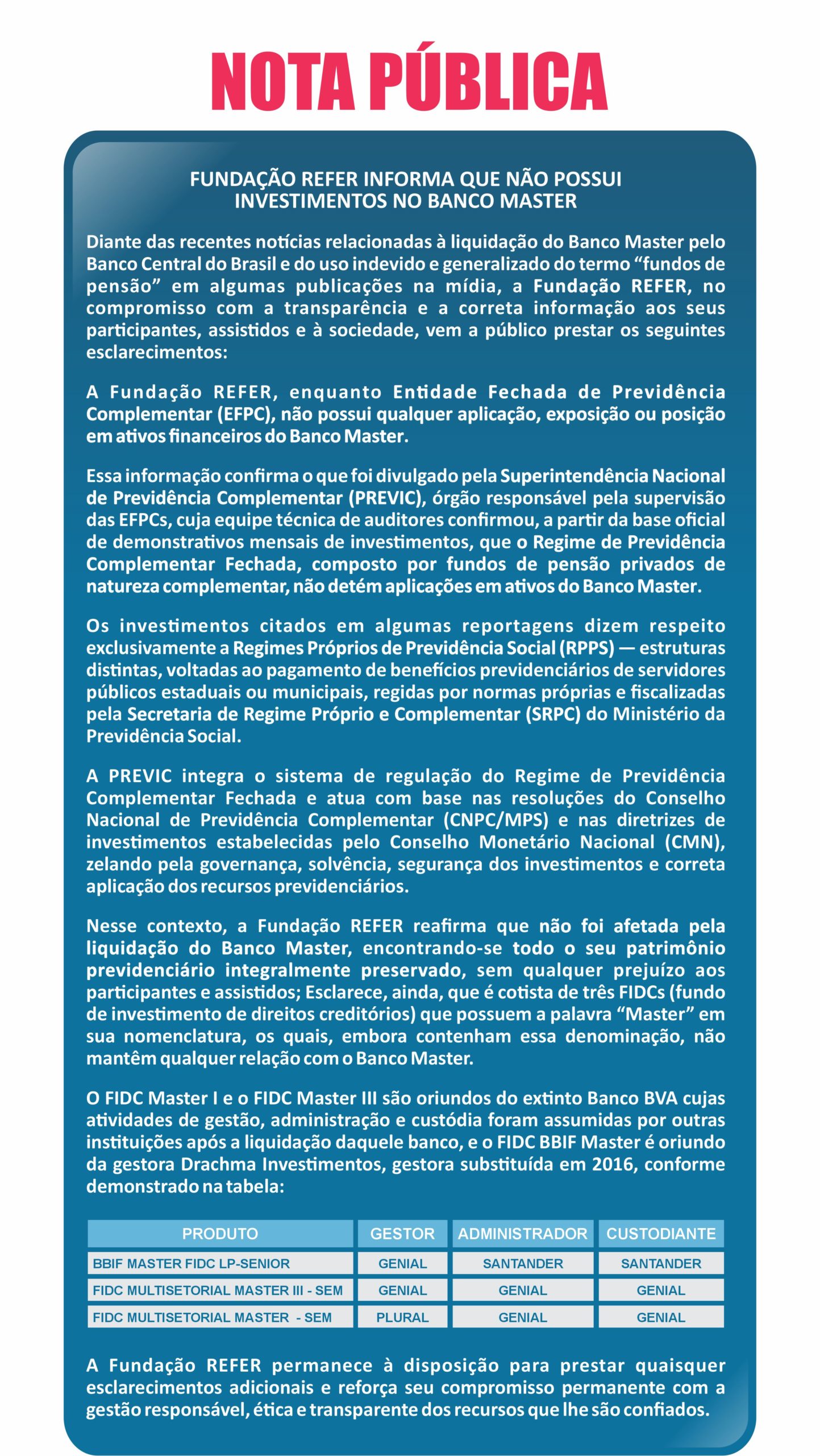 FUNDAÇÃO REFER INFORMA QUE NÃO POSSUI INVESTIMENTOS NO BANCO MASTER