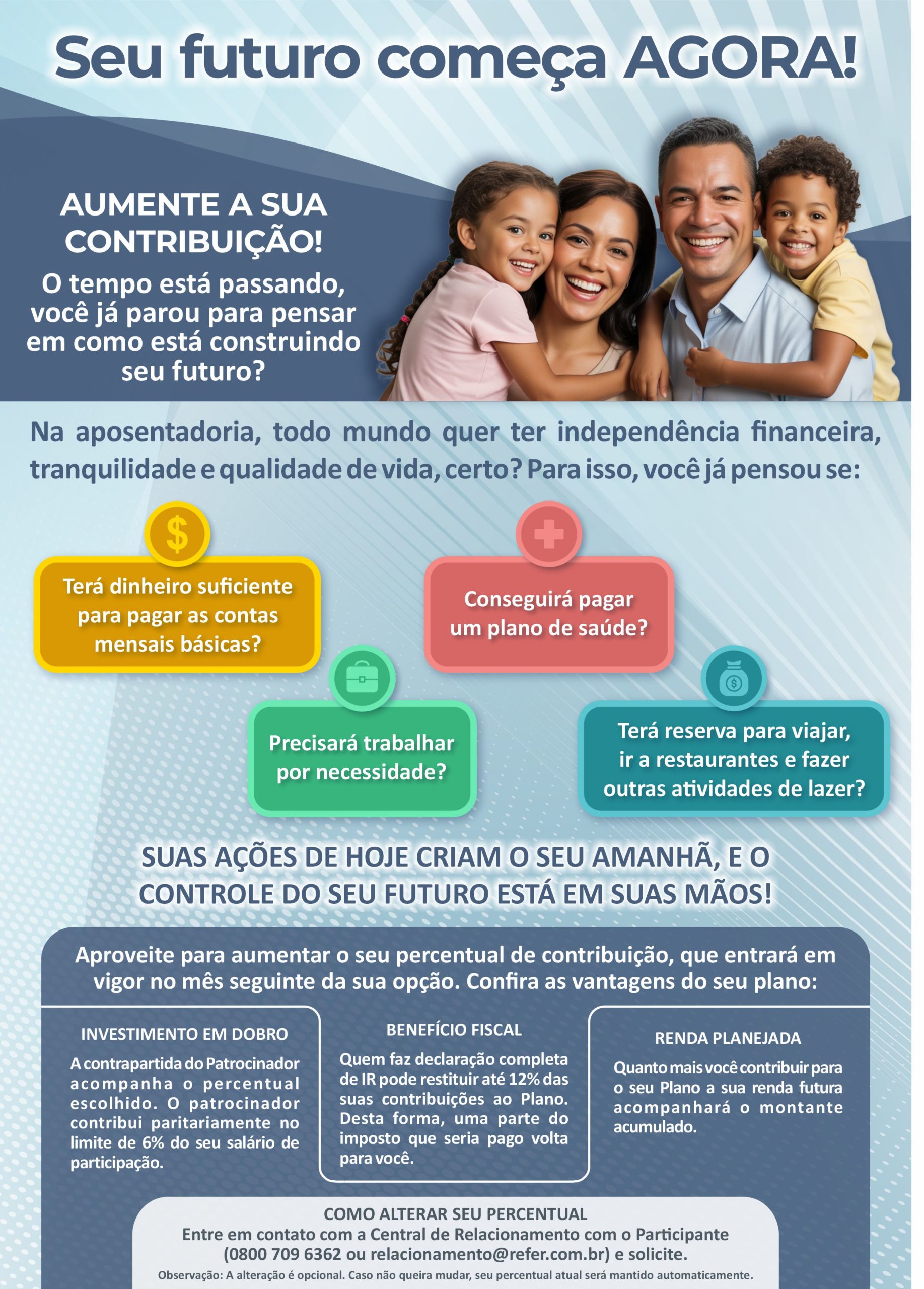Aumentar sua contribuição é investir no seu bem-estar e no de sua família. Com um planejamento adequado, você garante recursos para pagar as contas básicas, manter um bom plano de saúde, realizar viagens, aproveitar momentos de lazer e viver com tranquilidade.